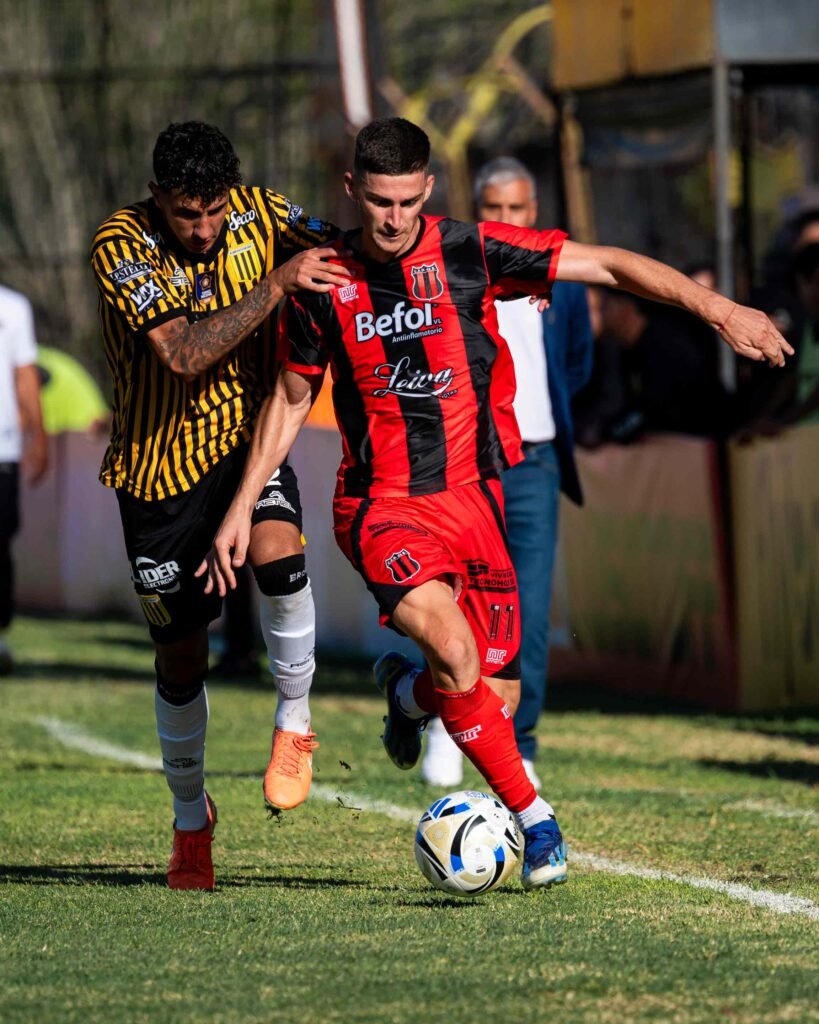 La pelota picó pasando la mitad de la cancha y Enzo tocó hábilmente para Moyano.
